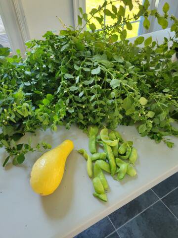 The pleasure of watching your plant babies grow form is awarding. The squash, lemon balm and snap peas.